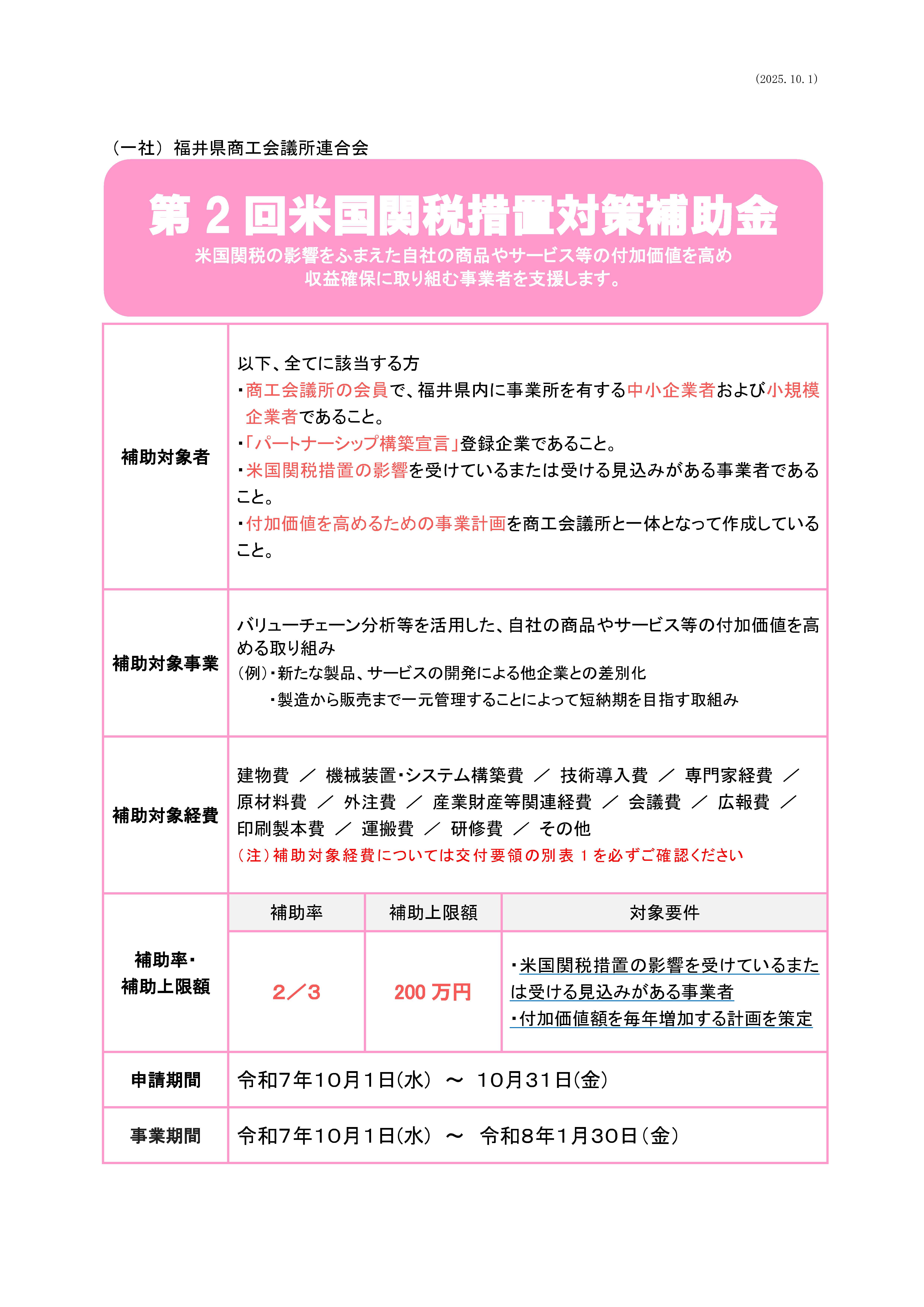 第2回米国関税措置対策補助金のご案内米国関税の影響をふまえた自社の商品やサービス等の付加価値を高め収益確保に取り組む事業者を支援します。 -