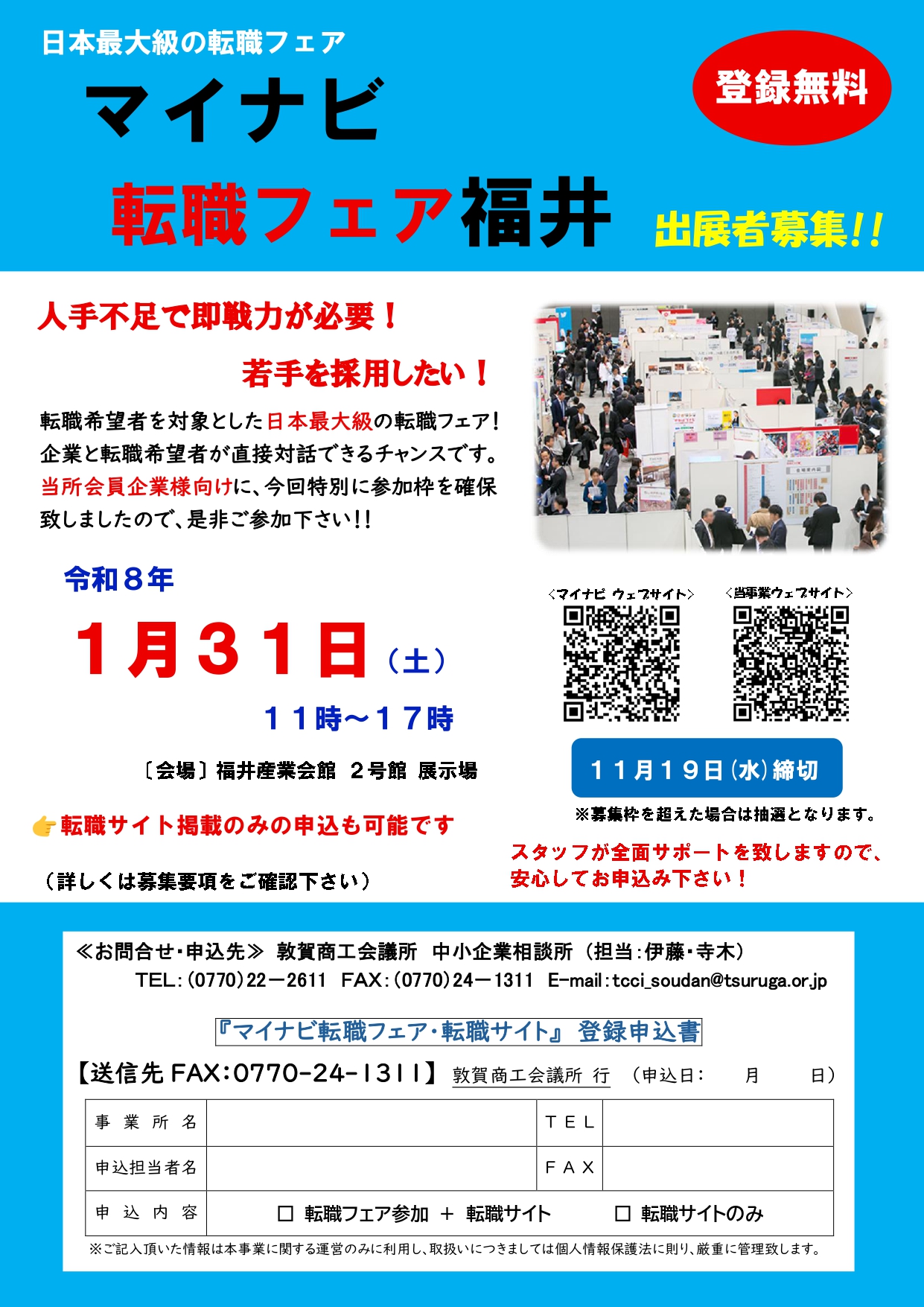 マイナビ転職フェア福井参加企業を募集します企業と転職希望者が直接対話できる合同説明会で、会社説明や面談が行えます。 -