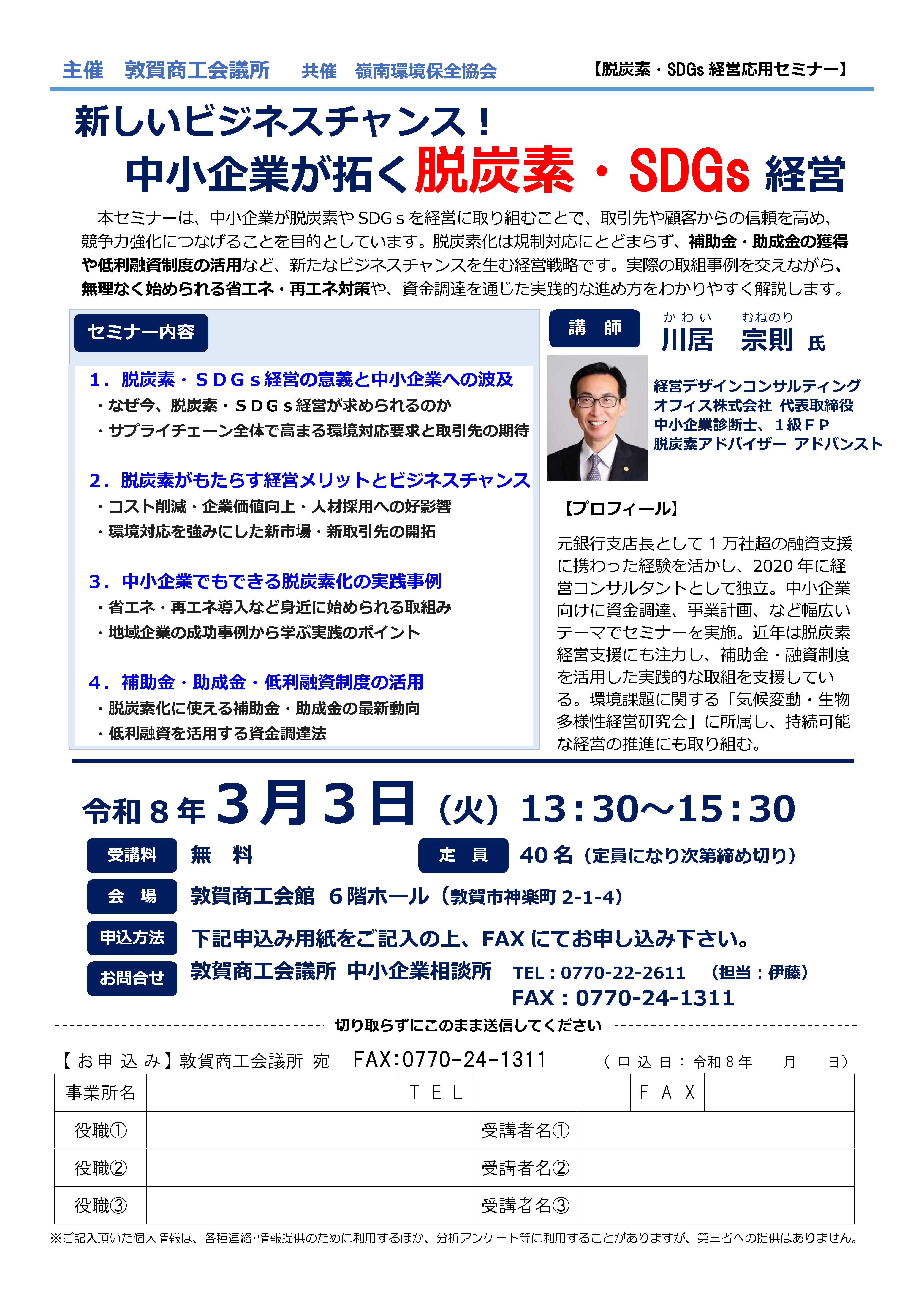 「脱炭素・SDGs経営応用セミナー」セミナー「脱炭素」は中小企業にとって、新しいビジネスチャンスです!これから取り組みたい方の「最初の1歩」のセミナーです。 -